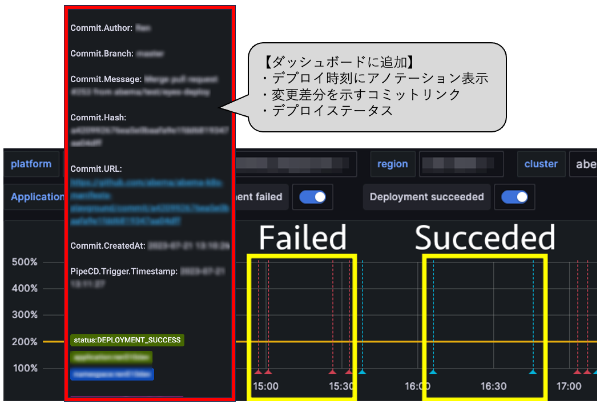 - ダッシュボード上に追加されたアノテーションからリソースの変更履歴および GitHub のコミットを特定できる