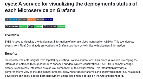 これらの課題に対し、私は 各マイクロサービスのデプロイ状況を統合監視基盤である Grafana 上で可視化するためのモニタリングツール(eyes と命名)の開発 に着手しました。