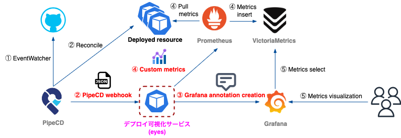 - eyes は、取得した Webhook の情報を元に、Grafana アノテーションを定義し、Annotations HTTP API を使用してダッシュボードにデプロイ情報を追加していきます。