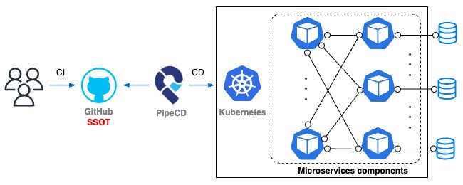- 開発者が GitHub のリビジョンブランチに変更を加えると、PipeCD の EventWatcher という仕組みによってデプロイを実行します。