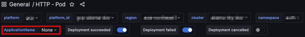 そして、ダッシュボード毎に Grafana Variables のクエリに以下の PromQL を設定することで、任意のダッシュボードに紐付くアプリケーションのみを選択できるようになります。