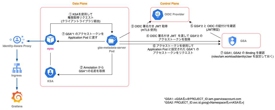また、他リージョンで稼働する eyes は Workload Identity を使用して、認証用のトークンを HTTP ヘッダ(Authorization: Bearer)に付加し、Grafana の Ingress エンドポイント に向けて投げることで IAP を突破します。