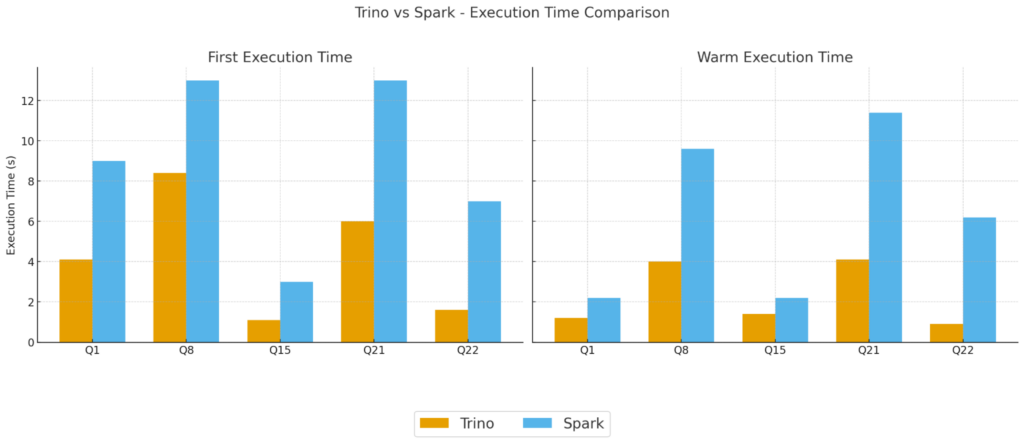 図1. Trino vs Spark の実行時間。(左辺)立ち上げ時。(右辺)その後の5回の平均値