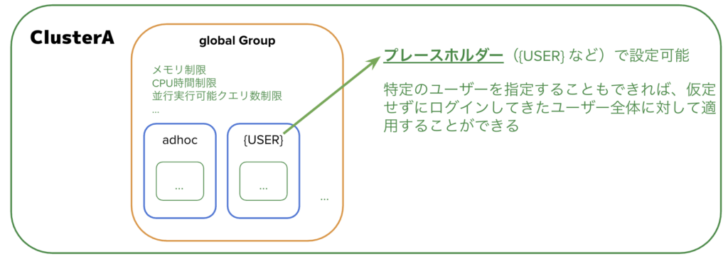 ResourceGroup はクラスタ内でのリソース(使用可能メモリ、CPU時間、並列実行可能クエリ数など)をグループごとに分け、ユーザーのグループによって使えるリソースを制限する設定です。図にすると以下のようになります:
