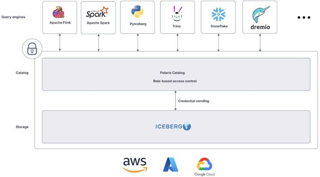 Polaris Catalog とは、REST API を通じて Iceberg テーブルのメタデータを管理するサービスです。図で表すと以下のような構成が考えられます。