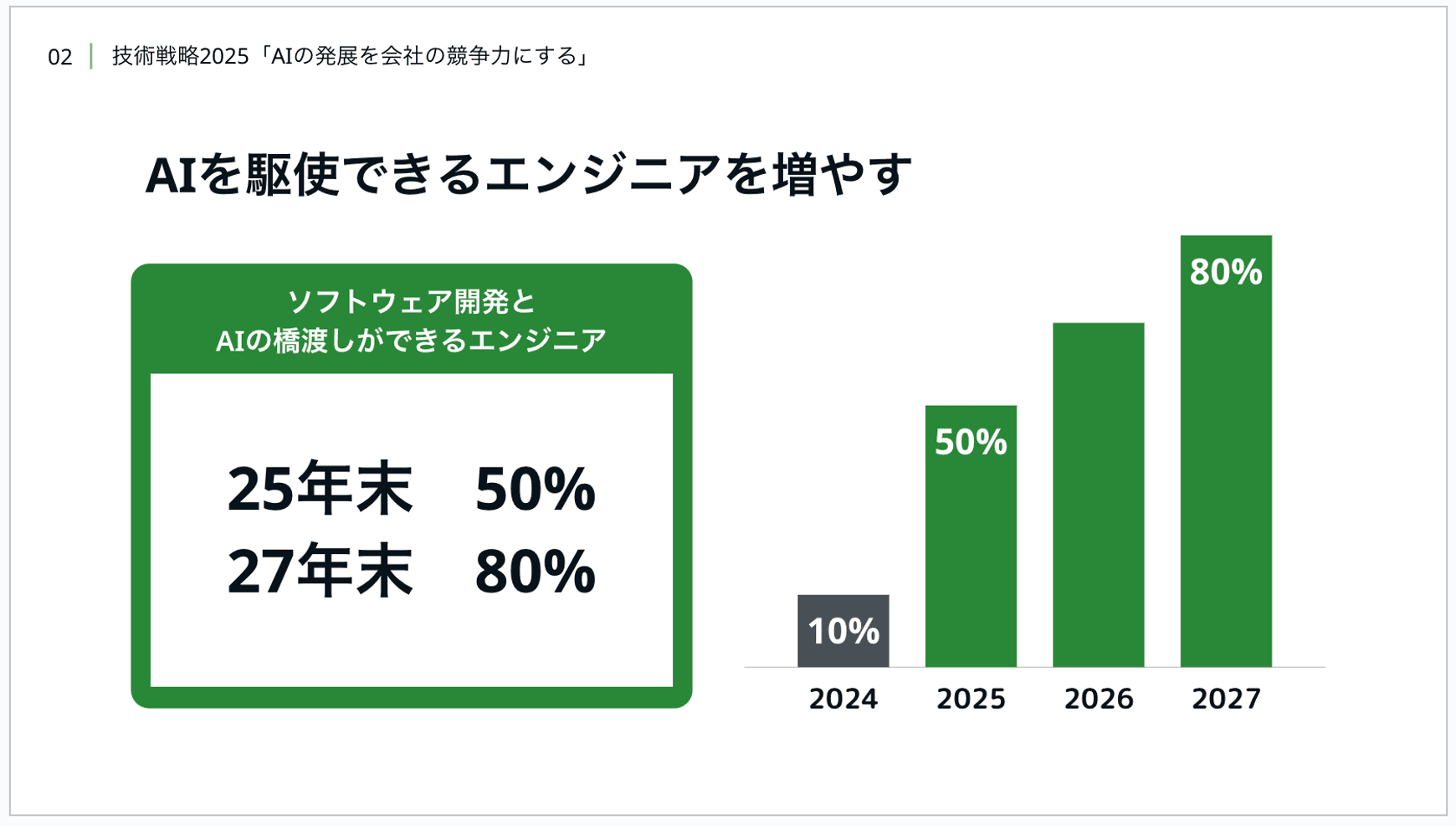 2024年10月の弊社テックカンファレンスで技術担当の専務執行役員である長瀬から『AIの発展を会社の競争力とする』というスローガンとAIを駆使できるエンジニア育成の定量目標の発表がありました。