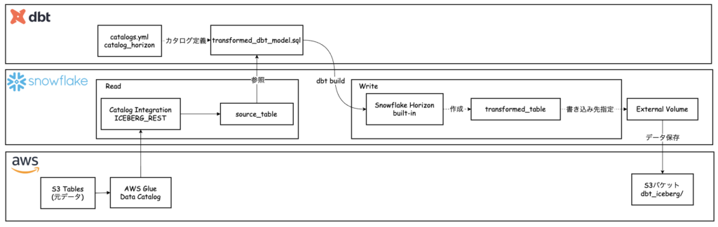 この構成により、既存のS3 TablesデータとAWS Glue Catalogを活用しながら、Snowflake 上で dbt による増分処理を用いたデータ変換パイプラインを構築できます。