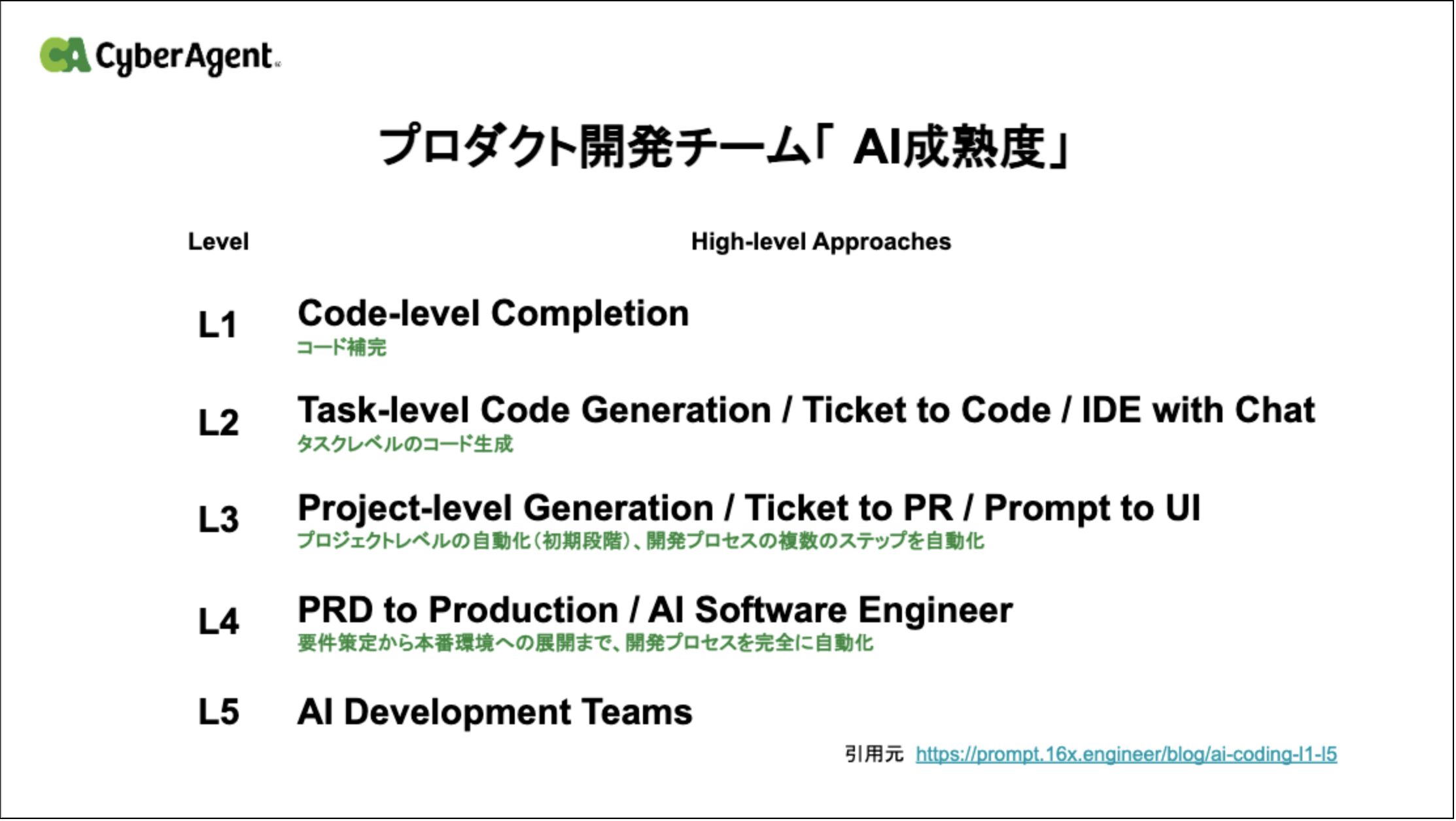CyberAgentではプロダクト開発チームにおけるAI成熟度が定義されています。