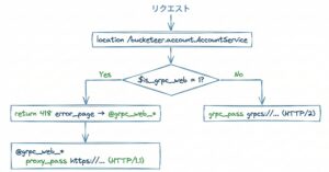 /bucketeer.account.AccountServiceにリクエストが来る$is_grpc_web = 1なら、error_page 418で@grpc_web_accountにリダイレクト@grpc_web_accountでproxy_pass(HTTP/1.1)として処理$is_grpc_web = 0なら、grpc_pass(HTTP/2)として処理