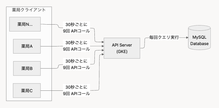 1回のポーリングで9回のAPIを呼び出していたのは、予約一覧、予約詳細、ステータス情報など、画面表示に必要な情報を複数のエンドポイントから取得していたためです。これに加えて、多数の薬局クライアントが同時にポーリングを実行するため、リクエスト数が膨大になっていました。