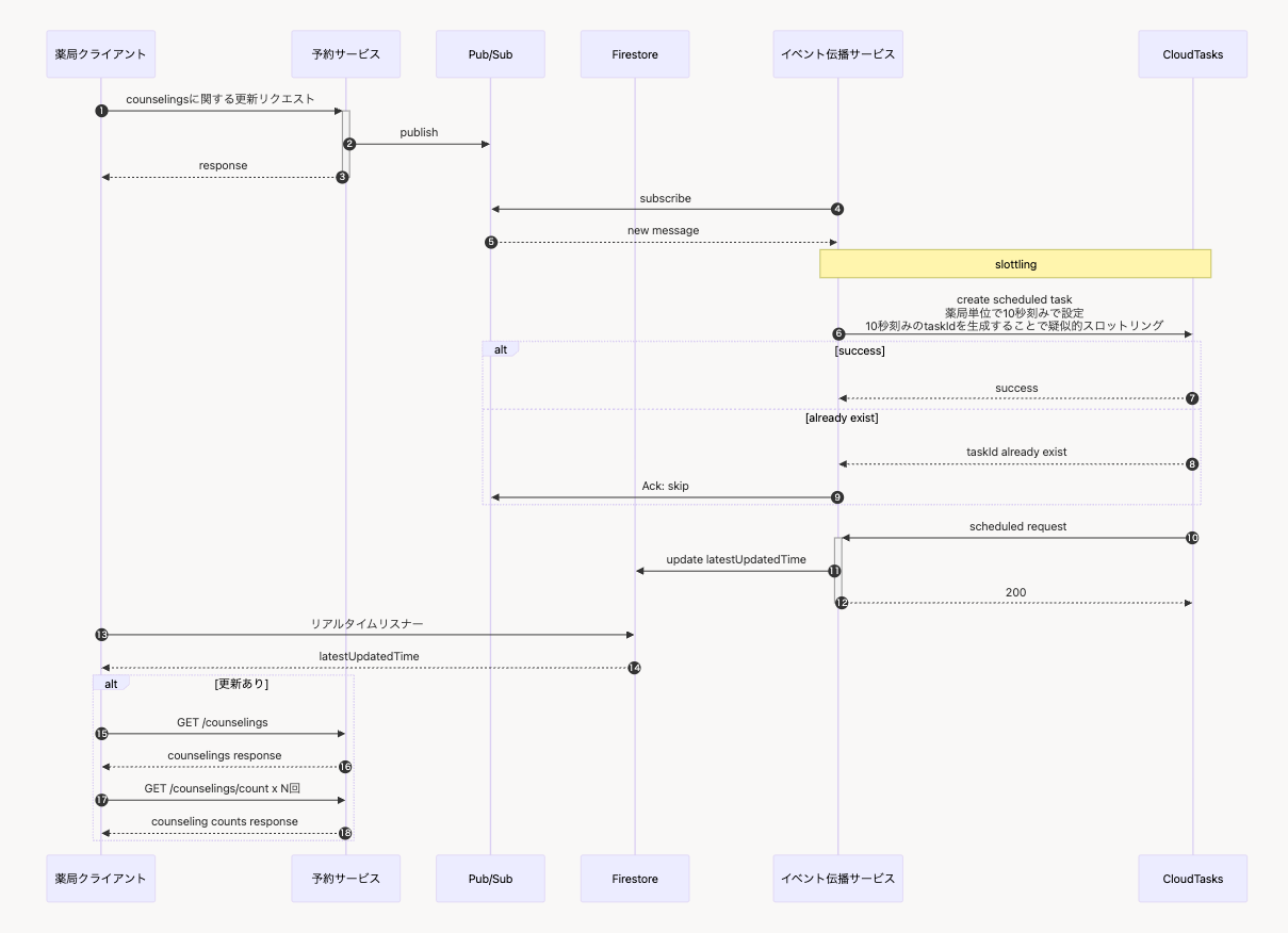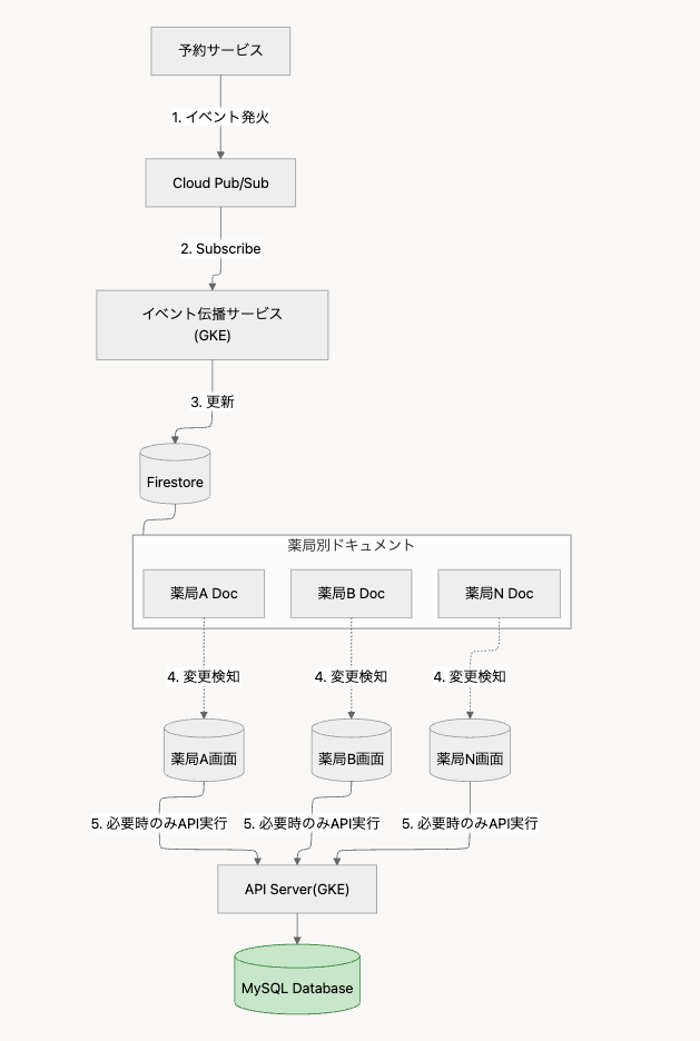 私たちが運用している予約管理システムでは、薬剤師が最新の予約情報をリアルタイムで確認できることが重要な要件でした。この要件を満たすため、フロントエンドから30秒間隔でAPIをポーリングする実装を採用していました。