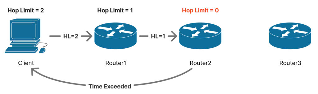 IPv6ãã±ããã«ã¯Hop Limitãšãããã£ãŒã«ããååšããã«ãŒã¿ãçµç±(Hop)ããããšã«ãã®å€ã¯1ã€æžç®ãããŸããHop Limitã0ã«ãªã£ããšãããã®ãã±ããã¯ç Žæ£ããããšåæã«éä¿¡è ã«Time Exceededãšããã¡ãã»ãŒãžãéä¿¡ããŸãã