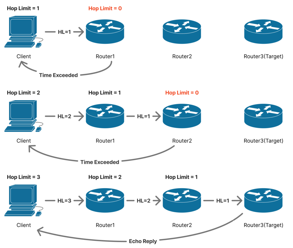 ·äœçã«ã¯Hop Limitã1, 2, 3âŠãšé çªã«å€§ããããŠãããEcho Reply(ãããã¯Destination Unreachable)ãåãåããŸã§ããè¿ãã°å®å