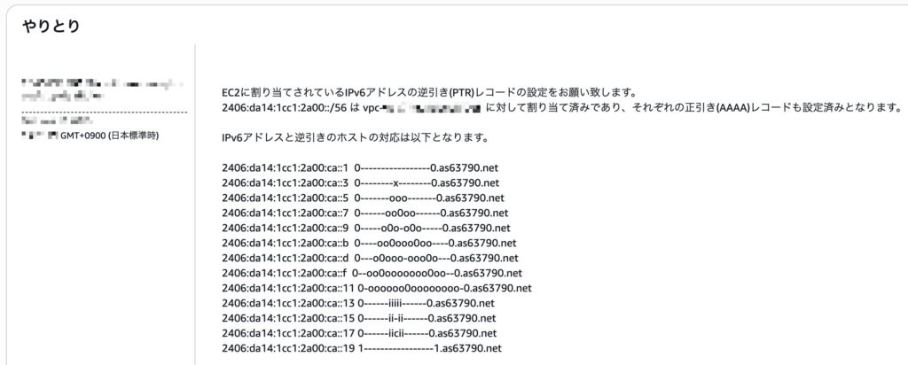 å ã»ã©èšå®ããDNSã®èšå®ã¯ãæ£åŒããã§ãããtracerouteæã«ã¯ãšãªãããã®ã¯ãéåŒããã§ããéåŒãã®DNSã¬ã³ãŒãã¯éåŒãã®ä»çµã¿äžãã®IPv6ã¢ãã¬ã¹(ãã¬ãã£ãã¯ã¹)ã®æã¡äž»ã§ãªããã°èšå®ãã§ããŸãããä»åå©çšããŠããAWSã®VPCå ã®IPv6ã¢ãã¬ã¹ã¯èªåã®æã¡ç©ã§ã¯ãªãããããŸã§ãAWSããå²ãåœãŠãŠããã£ãŠããã¢ãã¬ã¹ã§ãããã®ãããæã¡äž»ã§ããAWSã«ãé¡ããããŠèšå®ããŠãããå¿ èŠããããŸãã