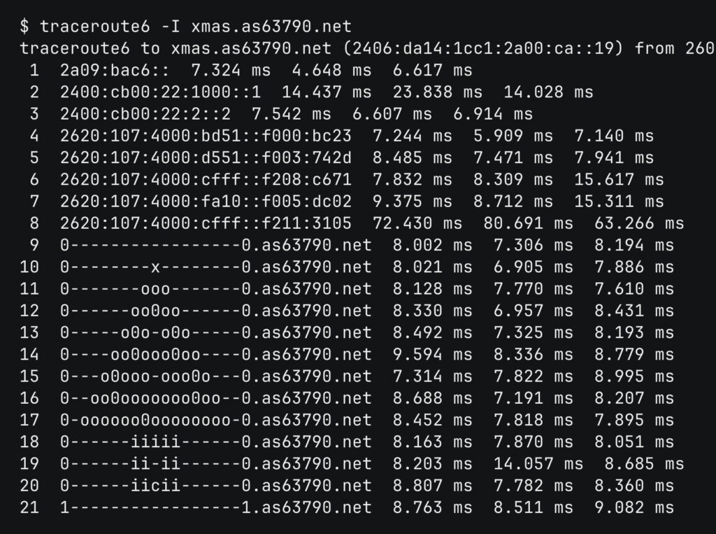 ãã¡ãã§ãã綺éºãªã¯ãªã¹ãã¹ããªãŒãèŠããŸãããIPv6ãããç°å¢ã§ã¯Mac, Linuxãã䜿ãã®æ¹ã¯cliã§ traceroute6 -I xmas.as63790.net (Windowsã¯tracert)ãšã³ãã³ããæã£ãŠããã ããšåçŸå¯èœã§ã(2026幎1æé ãŸã§ã®æééå®å