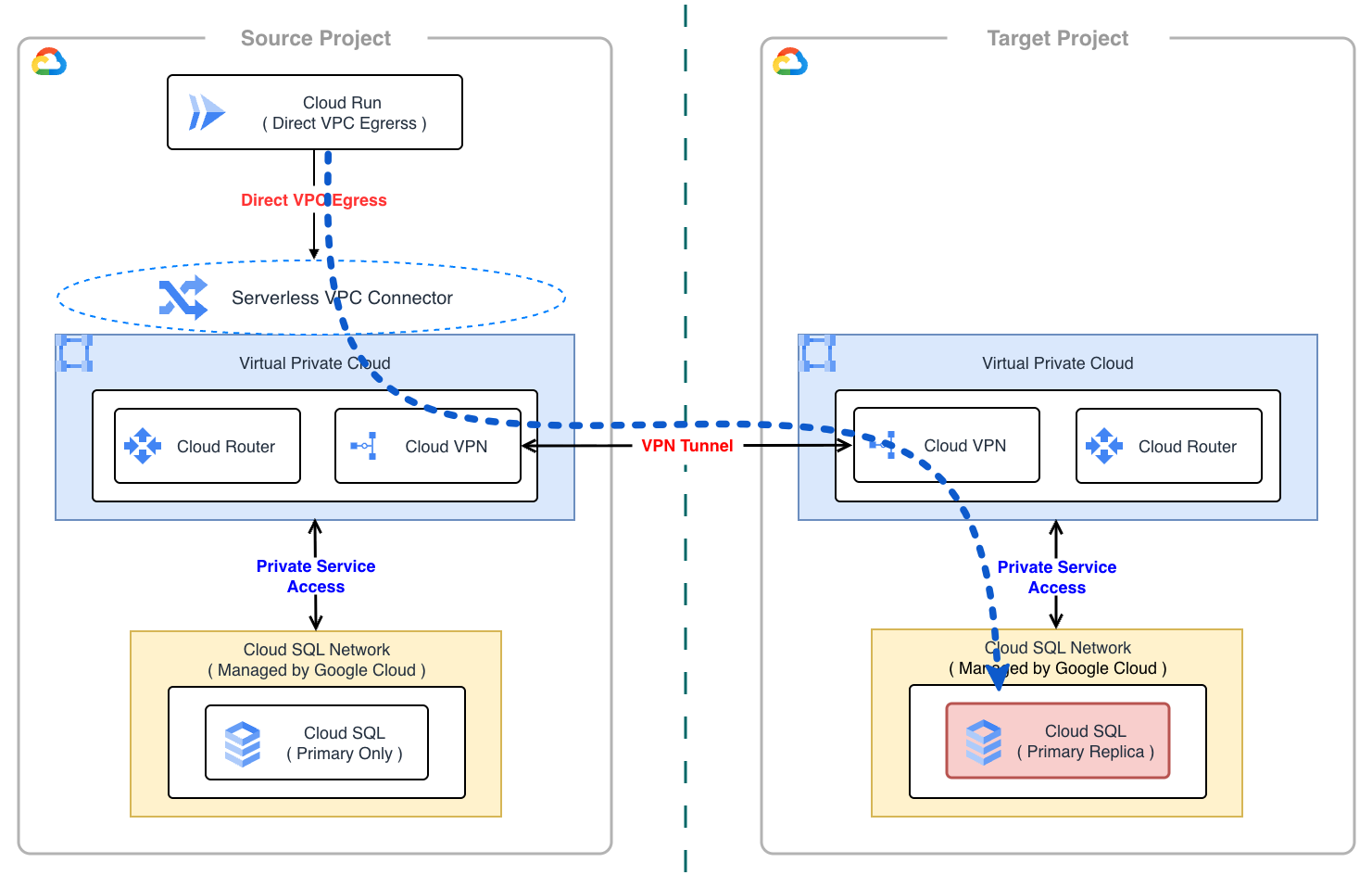 旧環境の Cloud Run では、VPC 内リソースへの接続に Direct VPC Egress を利用していました。今回の移行では、プロジェクト間を Cloud VPN で接続し、双方の VPC がプライベートネットワーク経由で疎通できるように構成することで、Cloud Run の構成を大きく変更することなく新環境への接続を実現しました。