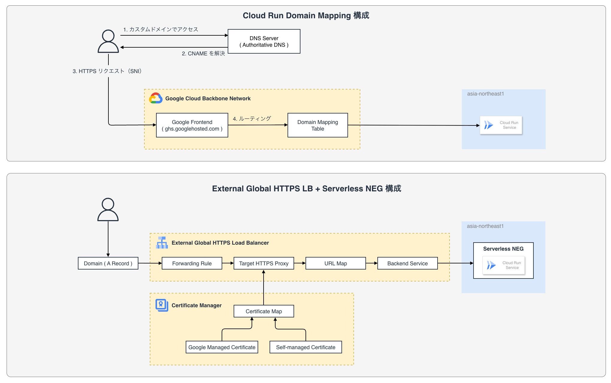 - Domain Mapping 撤退と GCLB 移行:新環境では Cloud Run Domain Mapping を廃止し、GCLB + Serverless NEG 構成へ移行する