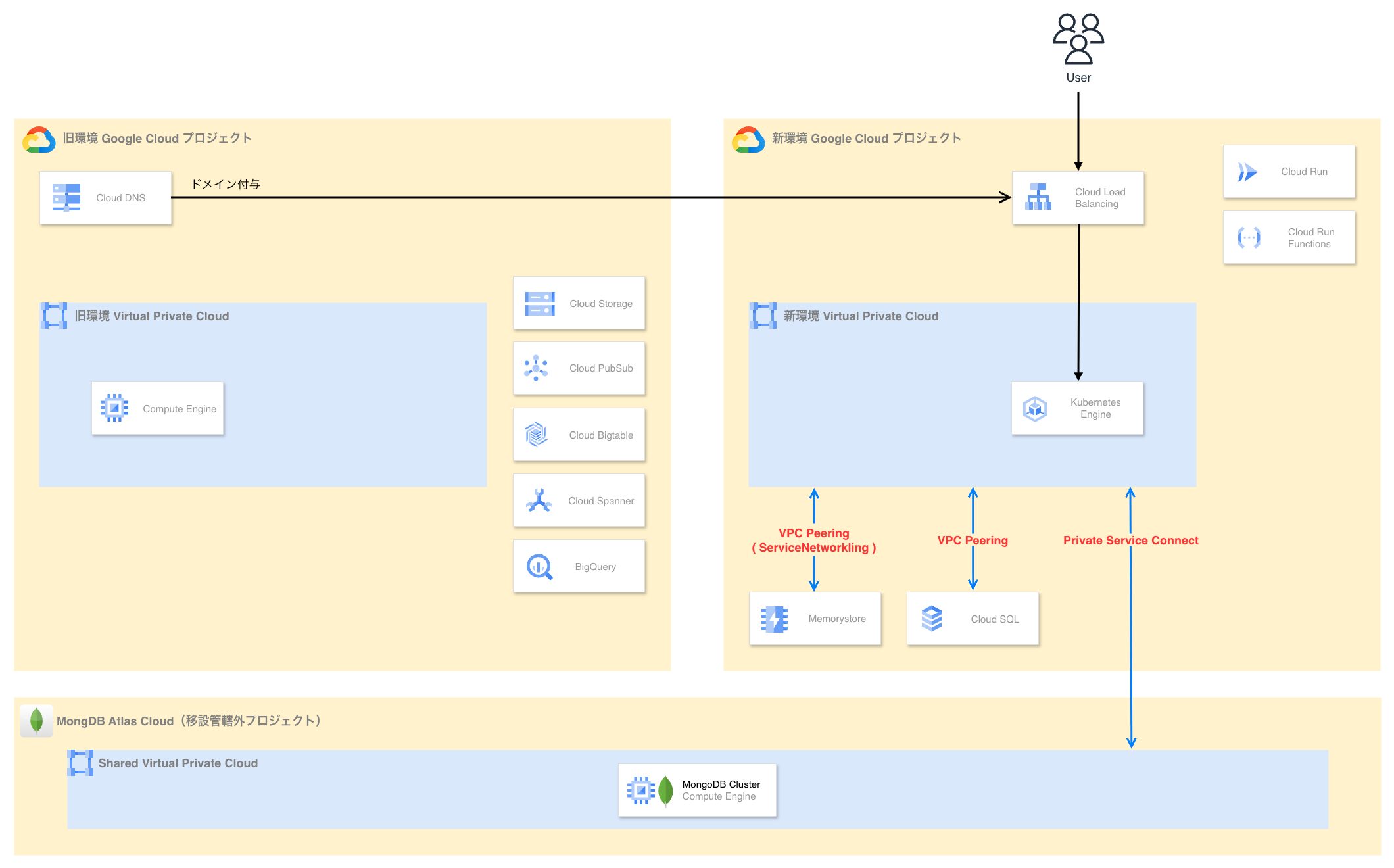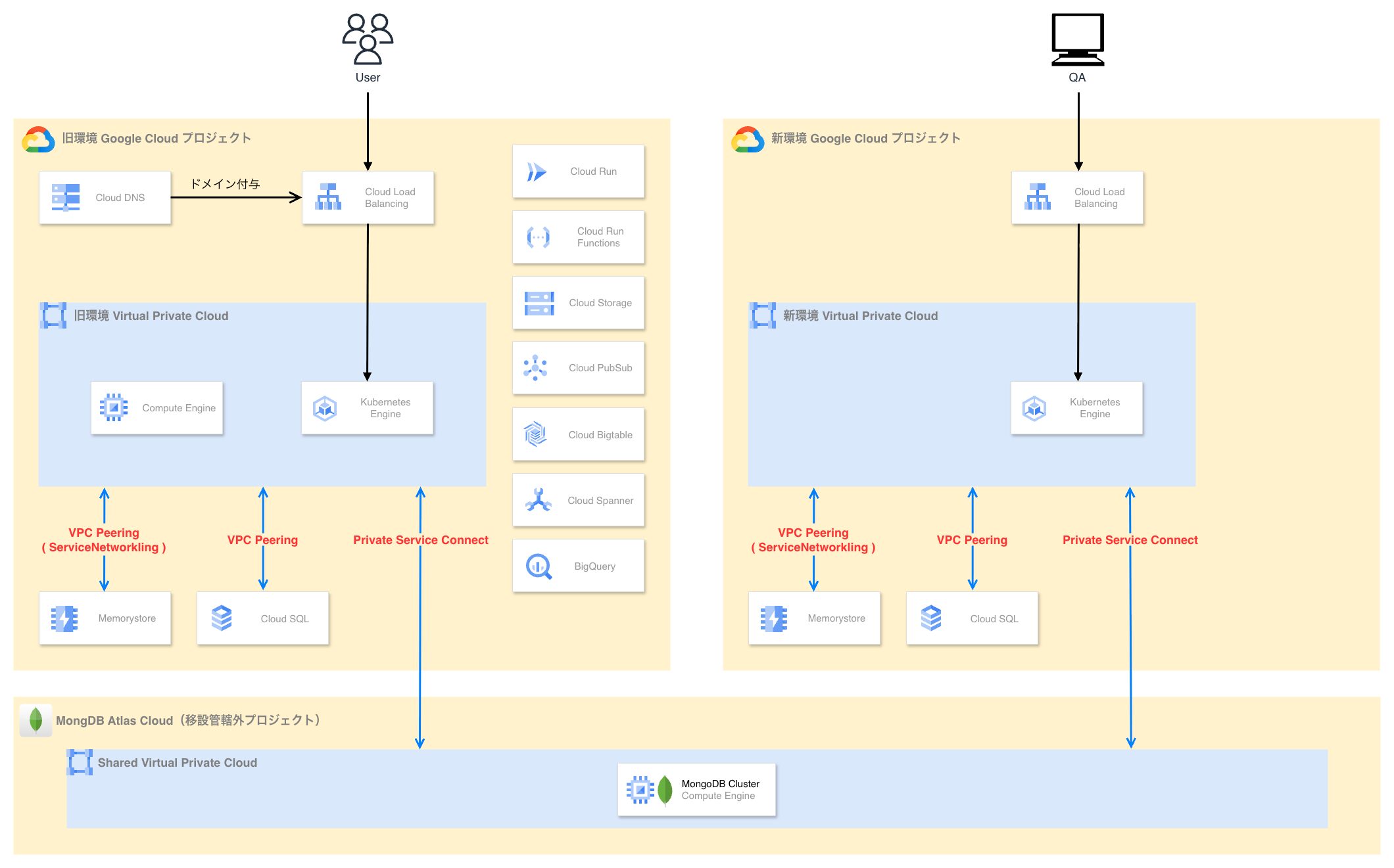 これらの構造的な課題は、アプリケーション側だけの対応や、既存インフラ構成を維持したままの改修だけでは解決できません。そこで、既存の構成を部分的に修正するのではなく、Google Cloud プロジェクトそのものを新規に準備し、そこへアプリケーションを移し替えるという、抜本的なリアーキテクティングを行う方針を固めました。