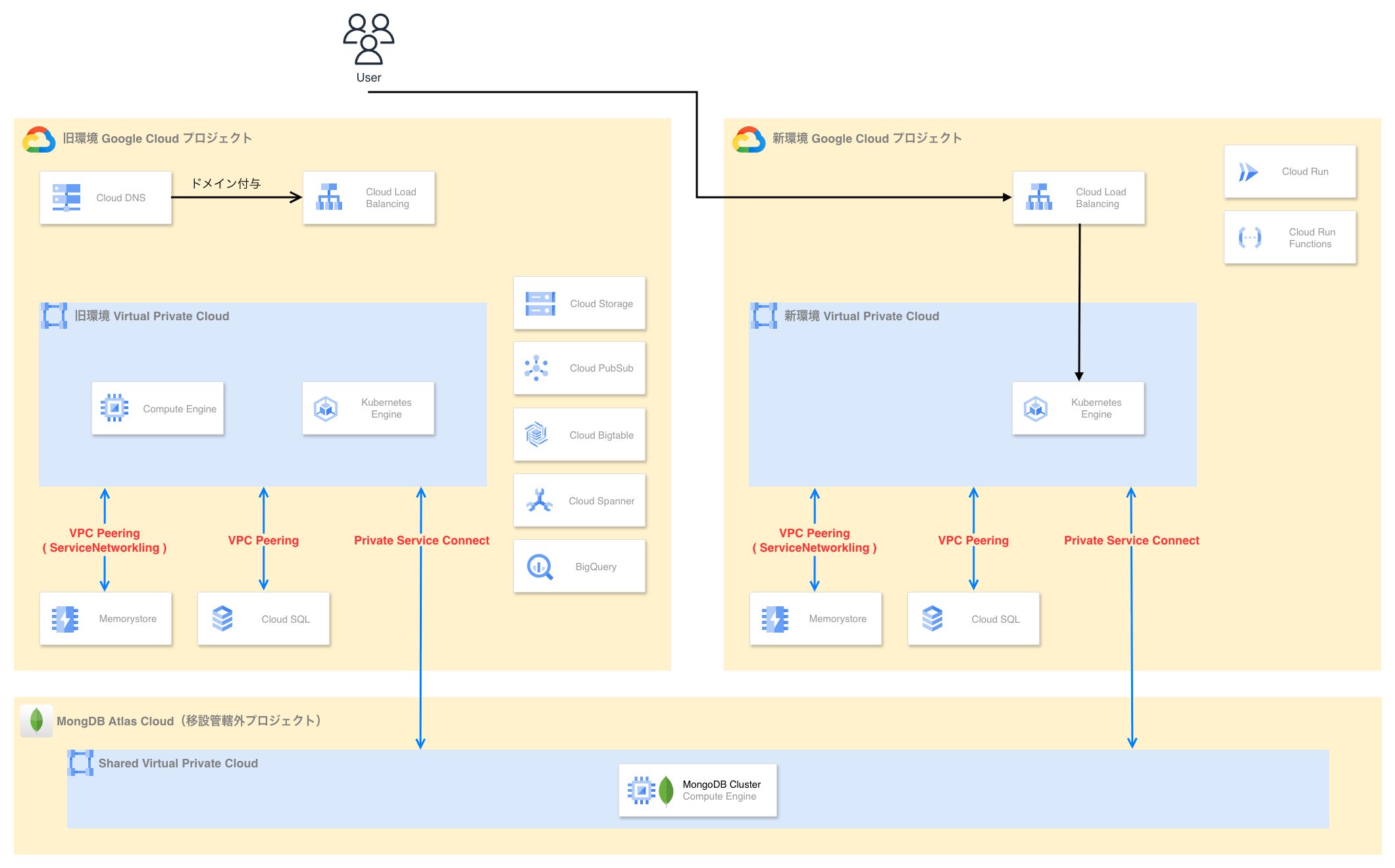 - IAM での制御が可能なデータストア(Spanner / Bigtable / Cloud Storage / BigQuery / PubSub 等)は移設を行わずひとまず既存プロジェクトに残留する
