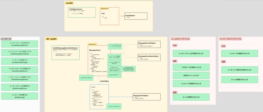 オンボーディングの一環として、仮のマッチングアプリのドメインを例に、DDD(ドメイン駆動設計)を用いたモデリングと実装のハンズオンを行いました。下の図は、このハンズオンのお題として作成したモデリング図です(あくまで学習用であり本番のモデリングとは異なる)。集約、値オブジェクト、ドメインイベント、リポジトリといった各要素の責務を整理し、いかに疎結合な設計を追求するかを議論する過程で作成しました。