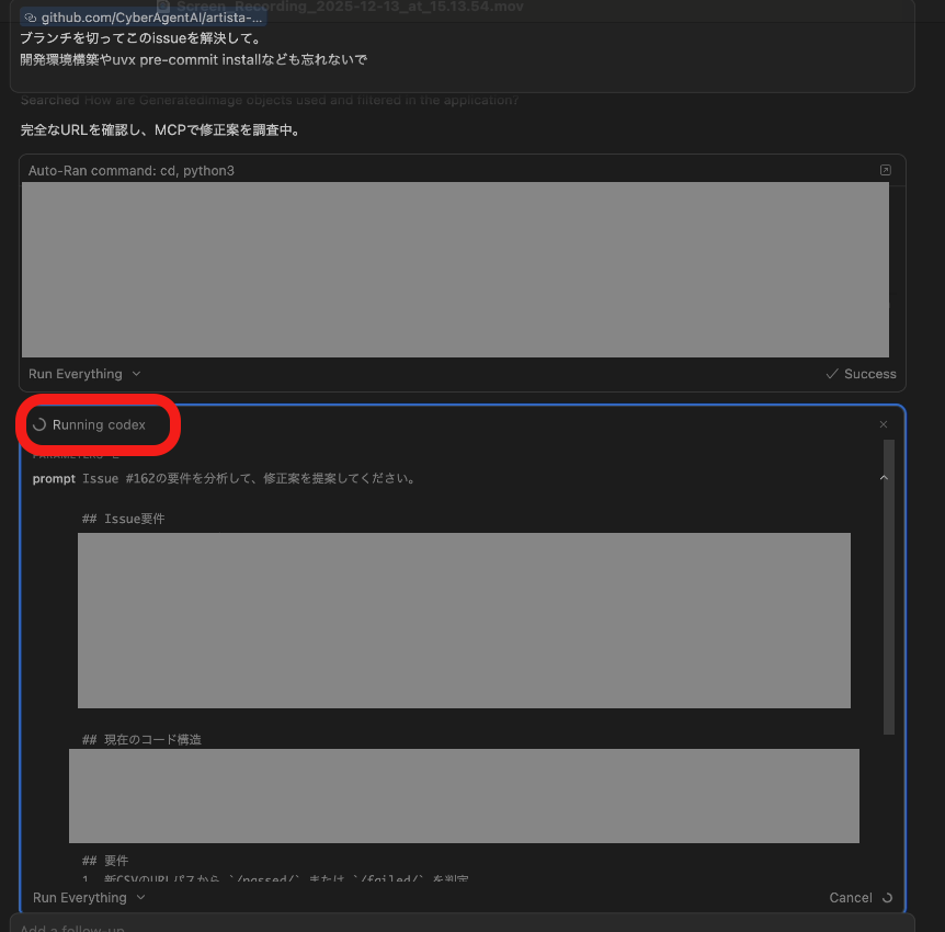 実際にCodex MCPが動作している様子は、上記の画像の通りです。複数のMCPを連携させて調査を行い、その結果を評価する一連の流れが自動化されています。