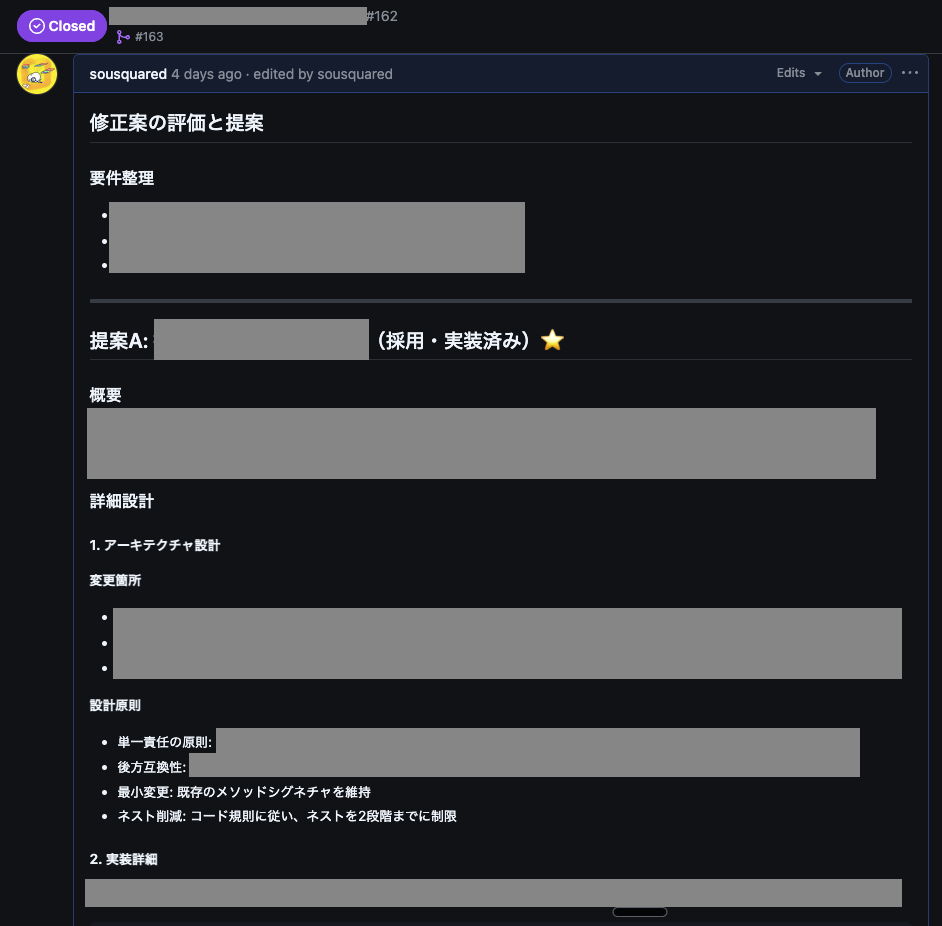 設計の履歴や差分を残したかったら、設計用PRを作って、そこで設計を更新し、最終版をIssueコメントにアップする方法も考えられます。この方法により、設計の変更履歴をGitで管理でき、レビューも行いやすくなります。