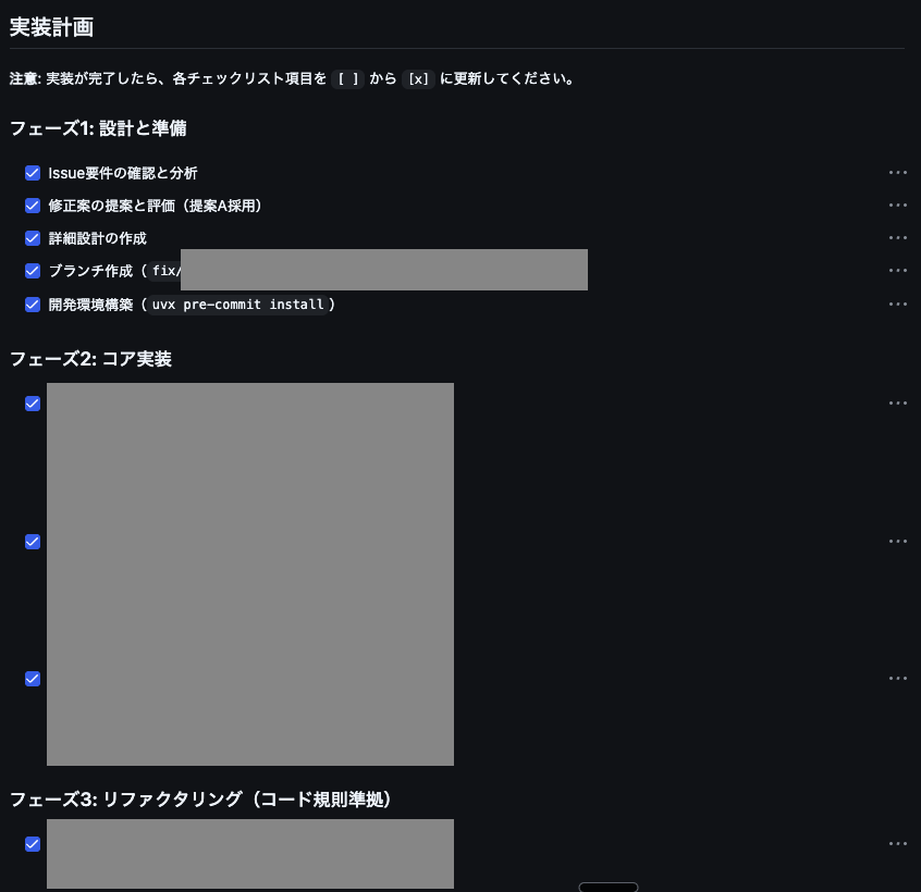 実装フェーズでは、採用された設計を踏まえて、実装計画を立てます。実装計画はIssueコメントを更新する形で記録します。実装プランをブレイクダウンさせてチェックボックスつくることで、Coding Agentsのコンテキストを最適に管理できますし、実装の進捗がわかりやすくなります。