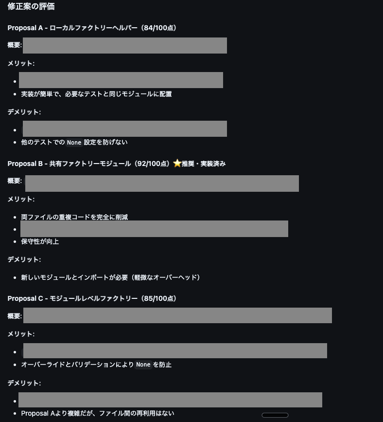通常、3個くらい提案してくれるし、推奨案も出てきます。これにより、複数の観点からコードを評価でき、より良い実装を選択できます。