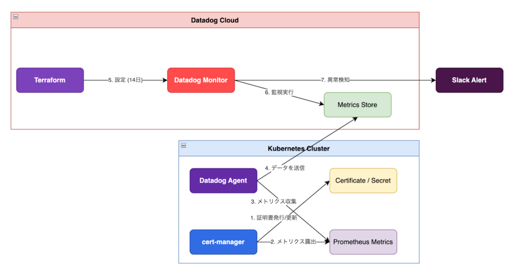 もう一つのタスクとして、cert-manager が発行する TLS 証明書の有効期限監視の自動化に取り組みました。Terraform を用いて、Datadog 上に適切なモニターを設定する一連のフローを構築しました。